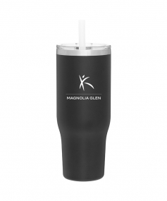40 oz double wall 18/8 stainless steel thermal tumbler with copper vacuum insulation, stainless steel rim, dual-purpose push-on clear lid, matching sliding closure, flexible wide silicone straw, and powder coated finish