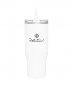 40 oz double wall 18/8 stainless steel thermal tumbler with copper vacuum insulation, stainless steel rim, dual-purpose push-on clear lid, matching sliding closure, flexible wide silicone straw, and powder coated finish
