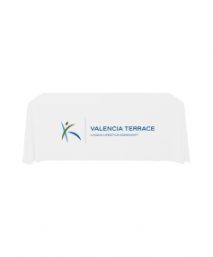 6' Standard PolyPoplin Throw style table cover with one color logo. Designed for quick and easy use while looking great. All corners are rounded meaning they will not gather and lay on the floor. Floor length on all 4 sides. Made from woven polyester. 72" L x 30" D x 29" H