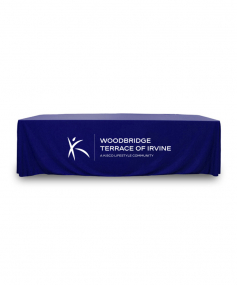 8 ft. Premium PolyKnit throw table cover with one color logo. Fits a 96 inch wide x 30 inch deep table. All corners are rounded meaning they will not gather and lay on the floor. Floor length on 4 sides. This cloth requires no ironing, is EasyCare machine washable and dryer safe.