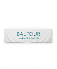 8 ft. Premium PolyKnit throw table cover with one color logo. Fits a 96 inch wide x 30 inch deep table. All corners are rounded meaning they will not gather and lay on the floor. Floor length on 4 sides. This cloth requires no ironing, is EasyCare machine washable and dryer safe.