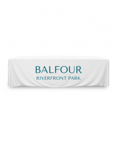 8 ft. Premium PolyKnit throw table cover with one color logo. Fits a 96 inch wide x 30 inch deep table. All corners are rounded meaning they will not gather and lay on the floor. Floor length on 4 sides. This cloth requires no ironing, is EasyCare machine washable and dryer safe.