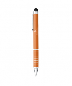 Aluminum Twist Action Ballpoint; Bold Enamel Color Finish; Shiny Silver Top, Clip, Pen Tip And Decorative Multiple Band Accents; Capacitive Soft Rubber Stylus Keeps Your Screen, Fingerprint Free! Comes With Black Ink. Complies with Prop 65. 2 1/4" W