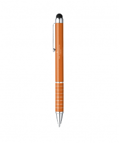 Aluminum Twist Action Ballpoint; Bold Enamel Color Finish; Shiny Silver Top, Clip, Pen Tip And Decorative Multiple Band Accents; Capacitive Soft Rubber Stylus Keeps Your Screen, Fingerprint Free! Comes With Black Ink. Complies with Prop 65. 2 1/4" W