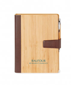 Bamboo and vinyl trim journal cover with vinyl lining, matching pen loop (pen not included) and a refillable spiral bound ECO journal containing 200 ivory lined pages. Bamboo is a natural fiber. 9 1/4" H x 7 1/16" W x 1 1/4" thick.
