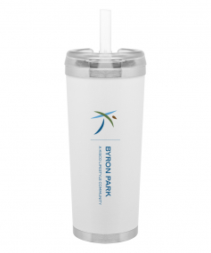 24 oz double wall 18/8 stainless steel thermal tumbler with copper vacuum insulation, stainless steel rim and base, threaded Eastman Tritan lid, snap closure, straw opening, and flexible wide silicone straw.