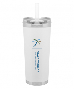 24 oz double wall 18/8 stainless steel thermal tumbler with copper vacuum insulation, stainless steel rim and base, threaded Eastman Tritan lid, snap closure, straw opening, and flexible wide silicone straw.