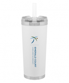 24 oz double wall 18/8 stainless steel thermal tumbler with copper vacuum insulation, stainless steel rim and base, threaded Eastman Tritan lid, snap closure, straw opening, and flexible wide silicone straw.