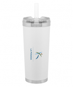 24 oz double wall 18/8 stainless steel thermal tumbler with copper vacuum insulation, stainless steel rim and base, threaded Eastman Tritan lid, snap closure, straw opening, and flexible wide silicone straw.