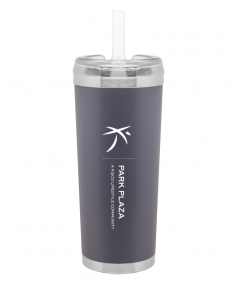 24 oz double wall 18/8 stainless steel thermal tumbler with copper vacuum insulation, stainless steel rim and base, threaded Eastman Tritan lid, snap closure, straw opening, and flexible wide silicone straw.
