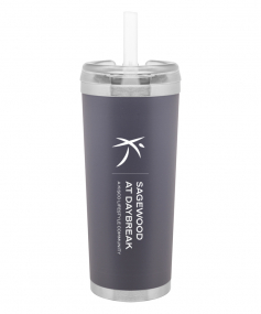 24 oz double wall 18/8 stainless steel thermal tumbler with copper vacuum insulation, stainless steel rim and base, threaded Eastman Tritan lid, snap closure, straw opening, and flexible wide silicone straw.