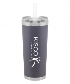 24 oz double wall 18/8 stainless steel thermal tumbler with copper vacuum insulation, stainless steel rim and base, threaded Eastman Tritan lid, snap closure, straw opening, and flexible wide silicone straw.