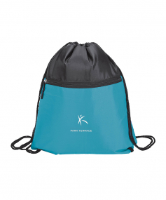Sport bag with a contrast color front-zippered pocket, reinforced corners and a drawstring closure. Drawstrings double as backpack straps. 12 1/2" W x 15 1/2" H x 3/16" D.