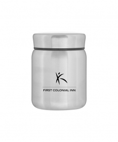 16.9 oz double wall 18/8 stainless steel thermal food container with copper vacuum insulation, matching threaded lid, threaded insulated lid, and rubber bottom. Individual gift box. Hand wash recommended. Do not microwave. Complies with FDA, Prop 65. 5.25" H x 3.875" W