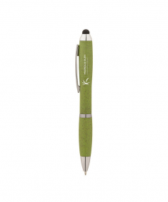 The Olivia Twist-Action Plastic Ballpoint Pen is made from a 50/50 blend of renewable wheat straw, which is the stalk left over after the harvest of wheat grains and ABS plastic. It has chrome trims, a metal clip and a capacitive stylus for touch screen devices. This pen makes a great eco-conscious gift and writes in black ink.