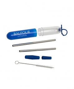The Paloma 5-Piece stainless steel straw set comes in an oval cylinder case with a transparent cap and a colored bottom. The lid has a beaded silicone locking strap to attach to your backpack, purse or bag making it convenient to travel with. This set includes 2 stainless steel straw parts that can be used individually or linked together with a silicone connector for use in taller cups, a cleaning brush and a silicone tip to drink from. The maximum straw length is 10 1/4" with the connector and . Complies with Prop 65. 1" W x 6" H x 1" D