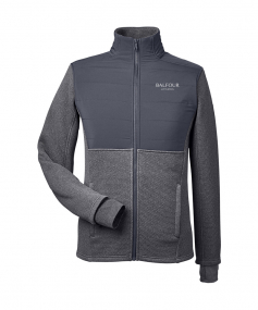 Pillow tech fabric: quilted, lightweight with warmth-retaining fill; Encore double-knit fleece with woven insulation for warmth and comfort.