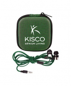 Molded textured case with zipper closure. Includes matching Braided Ear buds. Complies with Prop 65. 3.25" L x 3.25" H x 1.25" W