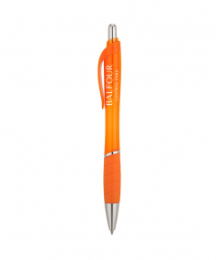 The Wave plunge-action ballpoint pen has a translucent hourglass barrel design and black ink. It has a matching color clip and rubber grip and chrome accents.
