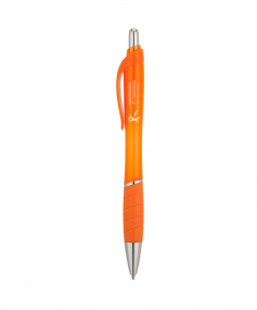 The Wave plunge-action ballpoint pen has a translucent hourglass barrel design and black ink. It has a matching color clip and rubber grip and chrome accents.