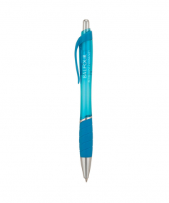 The Wave plunge-action ballpoint pen has a translucent hourglass barrel design and black ink. It has a matching color clip and rubber grip and chrome accents.